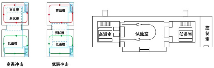 兩廂設(shè)備區(qū)分為高溫區(qū)和低溫區(qū)兩部分,測試產(chǎn)品置于提籃中,沖擊時(shí)提籃將測試產(chǎn)品移近高溫區(qū)或低溫區(qū)進(jìn)行沖擊,測試產(chǎn)品為動(dòng)態(tài)式。 采用觸控式操作界面,操作簡易TEMI8229,沖擊箱專用儀表,智能操作。 沖擊方式應(yīng)用風(fēng)路切換方式將溫度導(dǎo)入測試區(qū),做冷熱沖擊測試。 高溫沖擊或低溫沖擊時(shí),時(shí)間不低于999H,循環(huán)周期不小于9999次。系統(tǒng)可做自動(dòng)循環(huán)或手動(dòng)選擇性沖擊。 降溫效果快,不可以試驗(yàn)沖擊常溫。 |